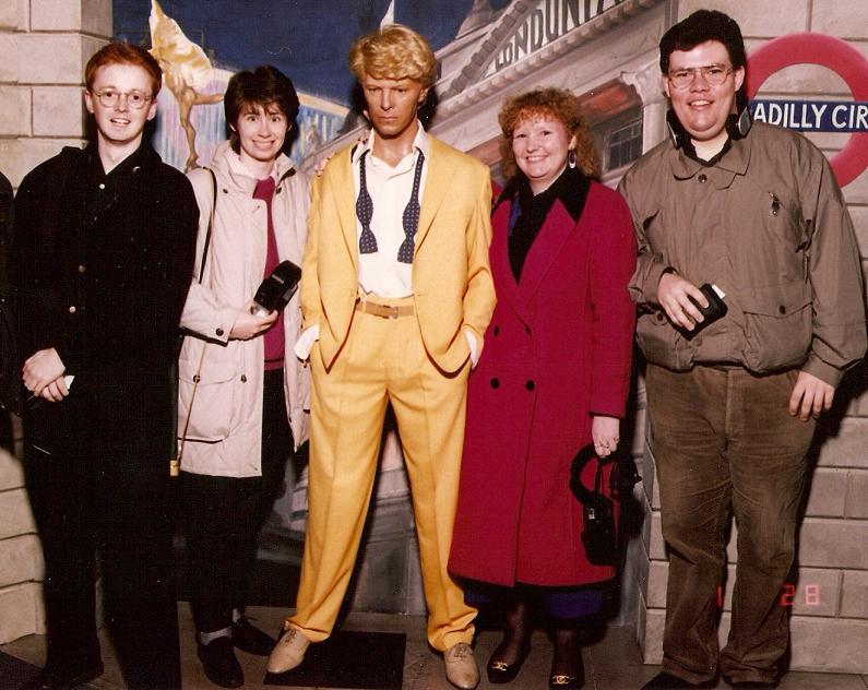 May 1991, ‘The Rock Circus’, Piccadilly, London: David Bowie drops in to pose with the waxworks of ‘The Four Farties’