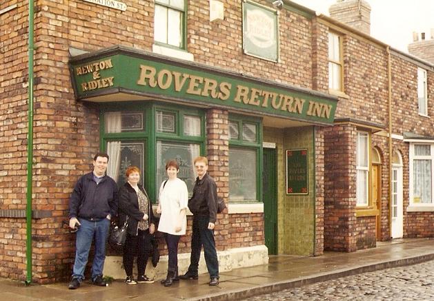 Right next door was ‘Mrs Hudson’s Tea Shop’ and we joined the queue for tea and a slice. There were no seats for a sitting so we stood and Trev appeared to be roped off presumably for security reasons. After this we explored the rest of the street then made our way outside where we found that the rain had stopped. Finally we hit Coronation Street and posed outside the ‘Rover’s Return’ whilst a kindly member of staff took a photo of each of us on our cameras. Down came the rain again. We took shelter in another souvenir shop. This one was full of ‘Corrie’ memorabilia and led into a room wherein took place a video presentation of some of the show’s most memorable moments.
